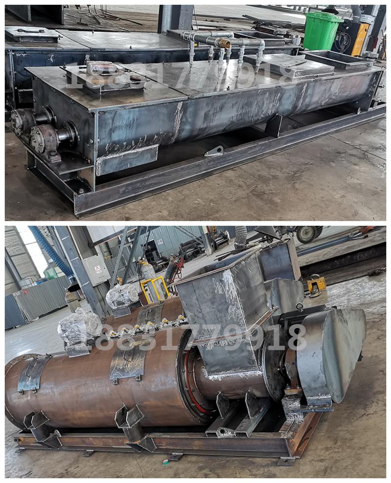 粉塵加濕機的攪拌筒通過其兩側的支撐架固定在機座上,給料電機固定在給料斗的旁邊,進料筒位于給料斗的下部,進料筒與攪拌筒同軸心且相互連通,主軸位于攪拌筒及進料筒內,主電機帶動主軸轉動,它是在進料筒內的主軸上且圍繞主軸固定有螺旋推料片,在攪拌筒內的主軸上均勻固定設置有攪拌棒,攪拌筒上均勻設置一排進水口,進水口與進水管相連,攪拌筒的上端還固定了一個震動電機,避免了加濕攪拌不均勻、不易發(fā)生粉煤灰粘結、運行安全可靠等特點。